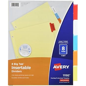 Avery Big Tab Insertable Dividers - 8 Tabs, 11192 (Pack of 2) Avery Big Tab Insertable Dividers, Buff Paper, 8 Multicolor Tabs, 1 Set (11192) 5 10 offers from $4.97 Avery Big Tab Insertable Dividers Buff Paper, 8 Multicolor Tabs, Pack of 3 Sets (11111) with Bonus AdvantageOP Custom Retractable Pen 73 in Binder Index Dividers 4 offers from $7.99 Special offers and product promotions