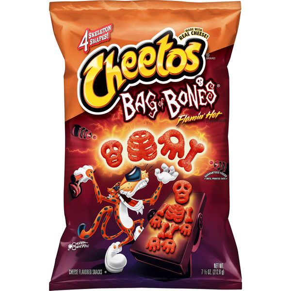 Cheetos Nutrition Facts Select a Cheetos product below to view the full nutrition facts, Weight Watchers points and ingredients. Our database currently contains 77 items from Cheetos. Bag Of Bones Cheese Snacks, White Cheddar Bag Of Bones Snacks, White Cheddar Cheese Baked Crunchy Cheese Flavored Snacks 7.625 Ounce Plastic Bag Caramel Eggs Shaped Puffs Flavored Snacks