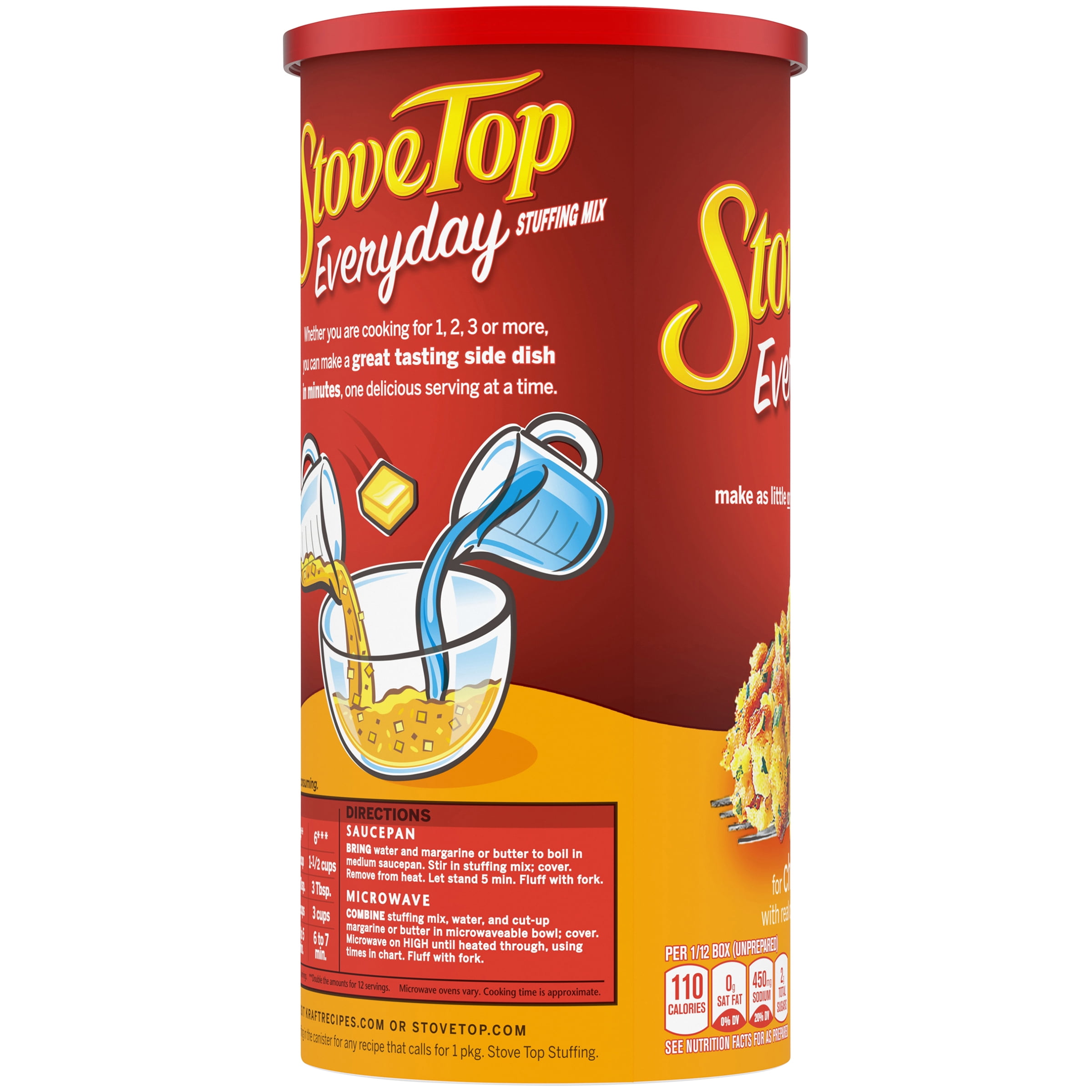 Kraft Stove Top Turkey Stuffing Mix 12 oz Box - My Food and Family Servings. Serving size 1/6 box (28g) Makes 1/2 cup. Serving per Container 12. * Nutrition information is estimated based on the ingredients and cooking instructions as described in each recipe and is intended to be used for informational purposes only. Please note that nutrition details may vary based on methods of preparation, origin and ... Nutrition Facts for Stove Top Turkey Stuffing • MyFoodDiary® Stove Top Turkey Stuffing Prepared w/ margarine Nutrition Facts Serving Size cup Amount Per Serving 150 Calories % Daily Value* 9% Total Fat 6g 8% Saturated Fat 1.5g Trans Fat 0g 0% Cholesterol 0mg 19% Sodium 440mg 7% Total Carbohydrate 21g 2% Dietary Fiber 0.5g Total Sugars 2g 4% Includes 2g Added Sugars Protein 3g 0% Vitamin D 0mcg 0% Calcium 0mg Nutrition Facts and Calories for KRAFT, STOVE TOP Stuffing Mix Chicken ... There are 107 calories in a 1 NLEA serving (makes 1/2 cup prepared) (28.000g) serving size of KRAFT, STOVE TOP Stuffing Mix Chicken Flavor. The calorie breakdown is 10% fat, 77% carbs, and 13% protein.
