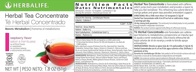Herbalife Instant Herbal Beverage with Tea Extracts Lemon Flavour, 50g BEST HERBALIFE Formula 1 Healthy Meal Replacement Nutritional Shake 500 FREE US. New. $31.06. Free shipping. 241 sold. Herbalife Formula 1 Healthy Meal ALL FLAVORS AVAILABLE. FREE SHIPPING! New. $39.99. Calories in Herbalife Herbal Tea Concentrate - Lemon and Nutrition Facts Herbalife Herbal Tea Concentrate - Lemon Nutrition Facts Serving Size 1/2 tsp Amount Per Serving Calories 5 % Daily Values* Total Fat 0.00g 0% Saturated Fat - Trans Fat - Cholesterol 0mg 0% Sodium 0mg 0% Total Carbohydrate 1.00g 0% Dietary Fiber 0.0g 0% Sugars 0.00g Protein 0.00g Vitamin D - Calcium - Iron - Potassium - Are loaded teas healthy? All about loaded tea ingredients Herbalife. One tablet of Liftoff contains multiple stimulants including ginseng, guarana and caffeine, while one serving of Herbal Tea Concentrate includes more stimulants from tea extract and ...