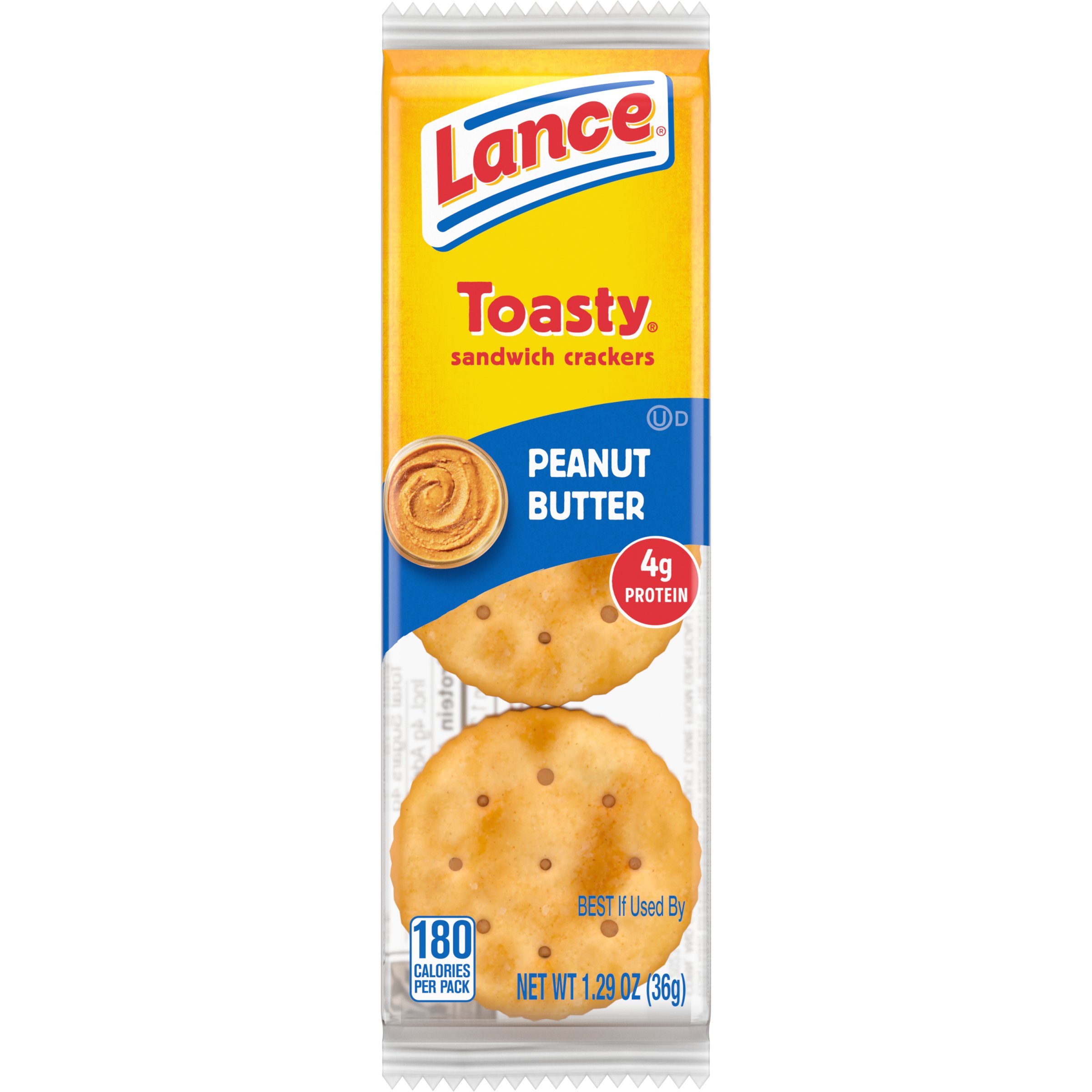 Lance Toasty Peanut Butter Crackers 1.29oz 8CT 10.3oz PKG Item #: 37273. Brand: Lance. UPC #: 076410901381. More Info. Ingredients. Nutrition Facts. Lance Toasty sandwich crackers combine real peanut butter with two toasty, baked crackers that fill you up and keep you going.