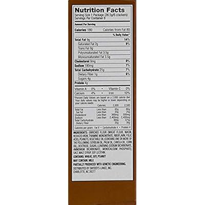 Lance peanut butter crackers nutrition label. fdc.nal.usda.gov › fdc-appFoodData Central The .gov means it’s official. Federal government websites always use a .gov or .mil domain. Before sharing sensitive information online, make sure you’re on a .gov or .mil site by inspecting your browser’s address (or “location”) bar. Ibotta: Earn Cash Back & Save With In-App Offers WebGet real cash back on your everyday purchases with Ibotta. Download the free app or browser extension for cash back on in-store and online shopping. Lance Real Peanut Butter Toast Chee Crackers - 60.8oz/40ct Description. Flaky, crunchy crackers with real, delicious peanut butter, these Lance Toast Chee Peanut Butter Crackers are the perfect on-the-go snack. These individually wrapped peanut butter crackers come 6 crackers to a pack, and this 40-Count box has enough crackers to keep everyone satisfied. With 5-Grams of protein in each package, these ... Lance Toasty Peanut Butter Sandwich Crackers 8 pk Allergy and ... Nutrition Label Nutrition Facts Serving Size 1.00 pkg Servings Per Container 8.00 Amount Per Serving Calories 180 Calories from Fat 80 % Daily Value* Total Fat 8g 12.3% Saturated Fat 2g 10% Trans Fat 0g Cholesterol 0g 0% Sodium 0.26g 10.83% Total Carbohydrates 21g 7% Dietary Fiber 1g 4% Sugars 3g Protein 4g