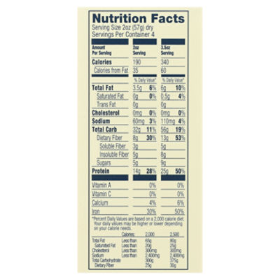 Chickpea Pasta Vs Regular Pasta - Is It Worth The Hype? - FoodHow.com Calories - 190 (Calories from fat constitute 5.8% of total calories) Sodium - 20mg - 1% of the daily value; Carbohydrates - 35g - 13% of the daily value; Protein - 11g - 22% of the daily value; Fiber - 5g - 18% of the daily value; Fat 3.5g - 4% of the daily value; Calcium 40mg - 3% of the daily value; Iron 3g - 20% of the daily value