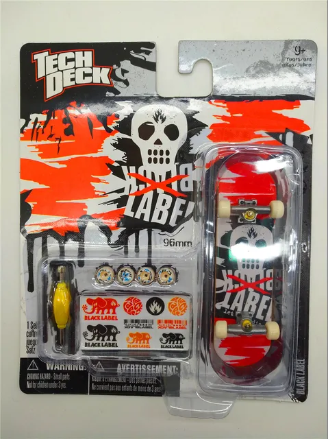 Tech Deck 3 pack: Black Label : BananaToys.com Tech Decks come with metal trucks, grip tape and real skate company graphics. Switch it out with the included set of graphic wheels and mess with the kingpin. With hundreds of designs from all the top skate companies, you ll want to collect them all." Features: Black Label 3 pack 96mm Skateboard 5 stickers Random designs Teck Deck
