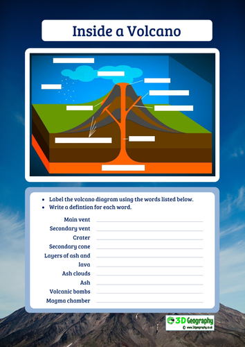 Volcano Diagram | Worksheet | Education.com Volcano Diagram. Discover the different parts of an active volcano! This illustrated science worksheet challenges students to label a colorful volcano diagram. A word bank full of terms such as "ash cloud," "crater," and "magma chamber" will help them along the way. This activity pairs well with the third-grade life science curriculum.
