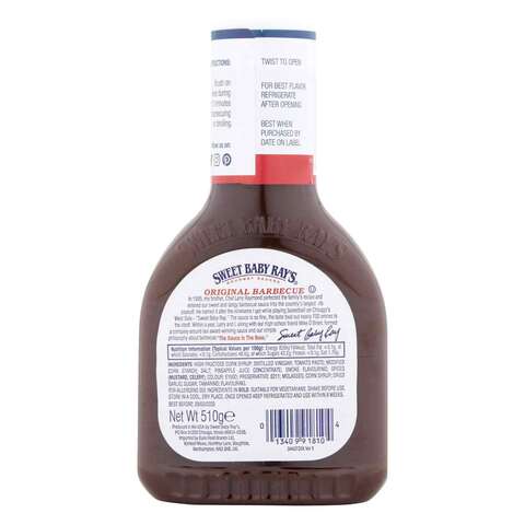 Sauce, barbecue, SWEET BABY RAY'S, original - Nutrifox The calorie breakdown is 2% fat, 96% carbs, and 2% protein. Full Nutrition Information. Amounts per. 1 tbsp (18.000g) ... Original Award Winning Barbecue Sauce The original, award-winning tangy-sweet pitmaster taste that started it all u2013 and still a favorite of BBQ fans all over the world. This deliciously thick ... Sweet Baby Ray's Calories and Nutrition Information. Page 1 Sweet Baby Ray's ; Barbecue Sauce, Maple. 2 tbsp, 70 ; Barbecue Sauce, Original, Bonus Pack. 2 tbsp, 70 ; Barbecue Sauce, Sweet 'n Spicy. 2 tbsp, 70 ; Barbecue ...