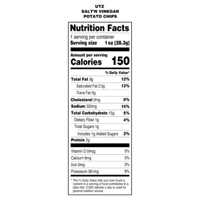 Salt and vinegar chips nutrition label. Utz Potato Chips Salt & Vinegar 7.75 oz. - Utz Quality Foods Utz Potato Chips Salt & Vinegar 7.75 oz. $63.99 12 Reviews Size 14 count 6 count Quantity - 1 + Add To Cart Shipping Info Reviews 12 Questions Write a Review 9 0 0 0 100% of reviewers would recommend this product to a friend Filters 12 Reviews SB Susan B. Verified Buyer I recommend this product Age Range 65+ Salty Acidic Perfect for... Salt & Vinegar Kettle Potato Chips - starbucks.com Menu / Snacks & Sweets / Salt & Vinegar Kettle Potato Chips. Salt & Vinegar Kettle Potato Chips ... Cholesterol 0 mg. Sodium 640 mg 28%. Total Carbohydrates 34 g 12%. Dietary Fiber 2 g 7%. Sugars 0 g. Protein 5 g. Nutrition information is calculated based on our standard recipes. ... Customers with allergies can find ingredient information for ... The Unhealthiest Potato Chips On the Planet — Eat This Not That Lay's Sour Cream & Onion-Flavored Potato Chips. Per 1 serving (15 chips): 160 calories, 10 g fat (1.5 g saturated fat), 160 mg sodium, 15 g carbs (1 g fiber, 1 g sugar), 2 g protein. Lay's sour cream and onion chips might be another bad you used to enjoy finding in your lunchbox, but this flavor is simply high in both fat and salt. Jimmy Johns Salt & Vinegar Jimmy Chips Nutrition Facts Jimmy Johns Salt & Vinegar Jimmy Chips Nutrition Facts Jimmy Johns Salt & Vinegar Jimmy Chips contains 290 calories, 17 grams of fat and 33 grams of carbohydrates. According to our website visitors, it's hard to tell if Salt & Vinegar Jimmy Chips from Jimmy Johns is a healthy option.