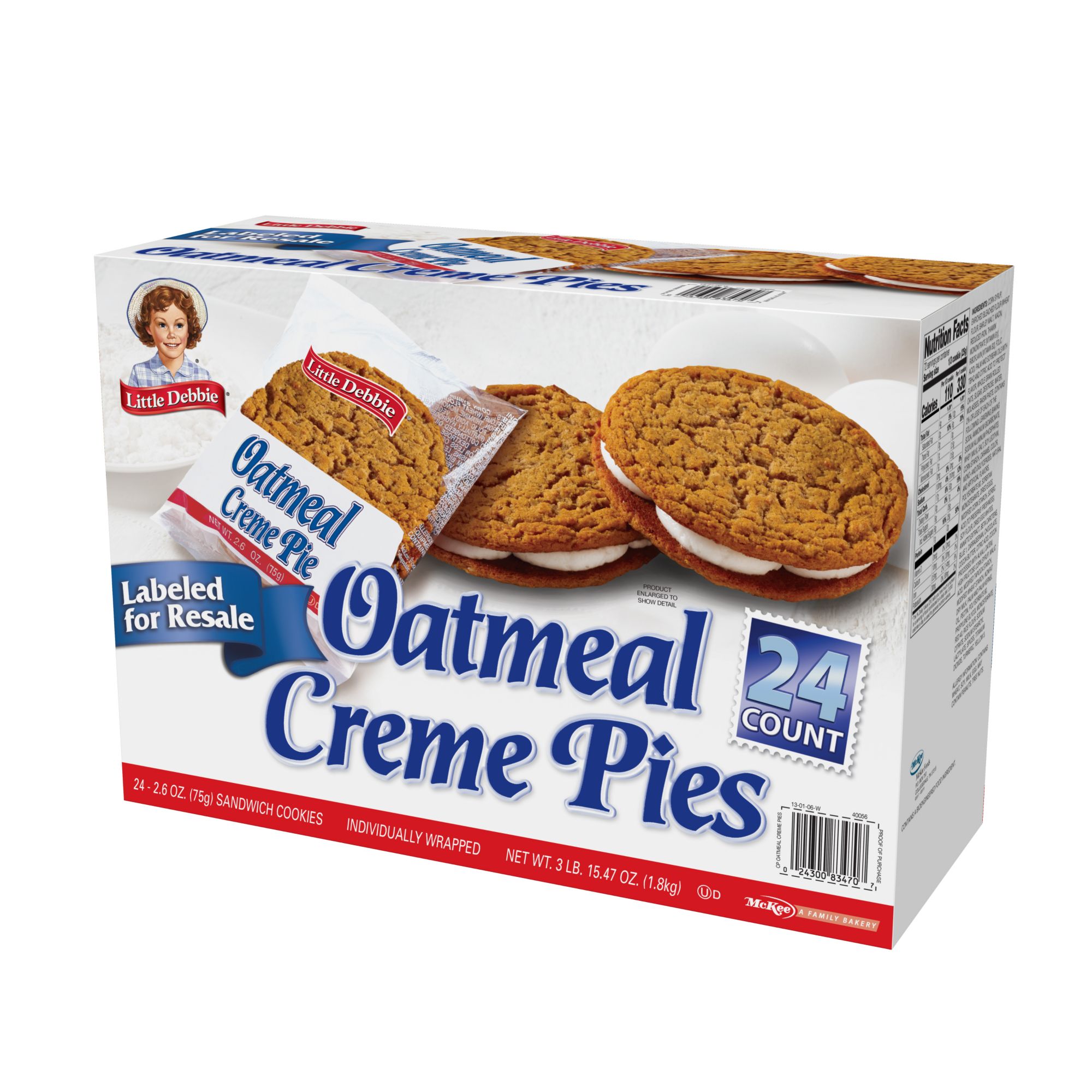 Little Debbie Big Pack Oatmeal Creme Pies, 32 oz - Water Butlers Each Little Debbie oatmeal creme pie has 330 calories per serving. They also come ready to eat. Little Debbie creme pies contain no trans fat and are free ... Little Debbie®Oatmeal Creme Pies Cereal - SmartLabel™ Little Debbie®Oatmeal Creme Pies Cereal. 14.5 oz. 00038000240492. Nutrition . Ingredients . Allergens . Features & Benefits . Company, Brand & Sustainability . 170. Calories. 0.5 g. Sat Fat. 125 mg. Sodium. 17 g. ... you how much a nutrient in a serving of food contributes to a daily diet. 2,000 calories a day is used for general nutrition ...