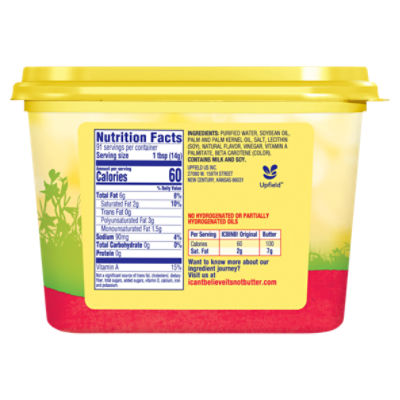 I Can't Believe It's Not Butter Spray Nutrition Facts & Calories - Inlivo I Can't Believe It's Not Butter Spray LOG KEY FACTS (learn about health benefits or risks) Has high calorie density - this means that the amount of calories you are getting from an ounce is high (0.19 cal/oz). Rich in vitamins and minerals (7.1%/cal) - a good source of Vitamin K and Vitamin A. I Can't Believe It's Not Butter! Oil Spray, 40% Ve...: calories ... I Can't Believe It's Not Butter! Oil Spray, 40% Vegetable, The Original nutrition grade D plus 0 Calories Per Serving 37 comments Rating: 4.48 with 421 ratings 7 followers Explanations Keto: net carbs 0g If you are following a ketogenic diet (keto), you need to restrict your daily carbohydrate intake so that your body enters ketosis. Calories in I Can't Believe It's Not Butter! Original Soft Spread and ... There are 60 calories in 1 tbsp (14 g) of I Can't Believe It's Not Butter! Original Soft Spread. Calorie breakdown: 100% fat, 0% carbs, 0% protein. Related Margarine from I Can't Believe It's Not Butter!: Light Vegetable Oil Spread Mediterranean Blend with Olive Oil Spread Original Cooking Spray Squeeze Original Stick Fat Free Spread 4 Set of 2 - I Can't Believe It's Not Butter Spray - amazon.com About the product I Cant Believe Its Not Butter Original Spray gives you great butter taste at your fingertips with 0g fat, 0 calories and 0g trans fat. It can be used for topping cooking and so much more. Spray on great butter taste and make your favorite foods even more delicious Includes 2 bottles - Net. Wt. 8 oz each bottle.
