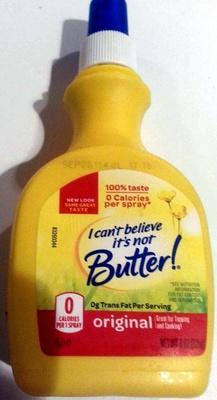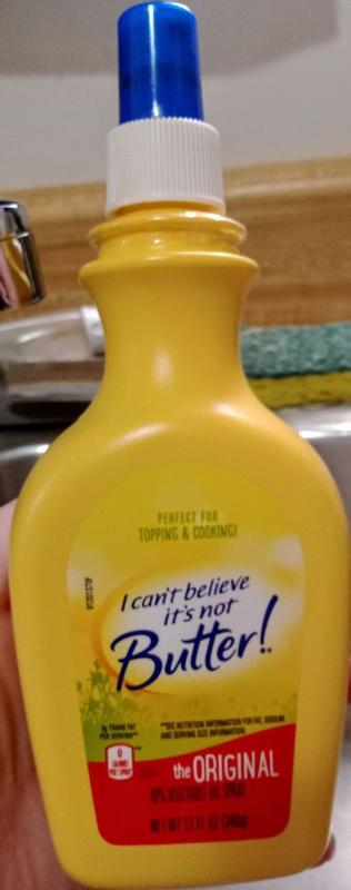 I Can't Believe It's Not Butter! Products, Calories and Nutrition ... Find calorie and nutrition information for I Can't Believe It's Not Butter! foods, including popular items and new products. Register | Sign In. Search in: ... Original Cooking Spray. Per 5 sprays - Calories: 0kcal | Fat: 0.00g | Carbs: 0.00g | Protein: 0.00g ... I Can't Believe It's Not Butter Class Action Says Cooking Spray Isn't ... According to the I Can't Believe It's Not Butter spray class action lawsuit, the product actually contains 124 grams of fat and 1,160 calories in each bottle. The Unilever margarine class action argues that the manufacturers of the product use very small serving sizes to make the claim that their product doesn't contain any calories or fat. 4 Set of 2 - I Can't Believe It's Not Butter Spray - amazon.com About the product I Cant Believe Its Not Butter Original Spray gives you great butter taste at your fingertips with 0g fat, 0 calories and 0g trans fat. It can be used for topping cooking and so much more. Spray on great butter taste and make your favorite foods even more delicious Includes 2 bottles - Net. Wt. 8 oz each bottle.